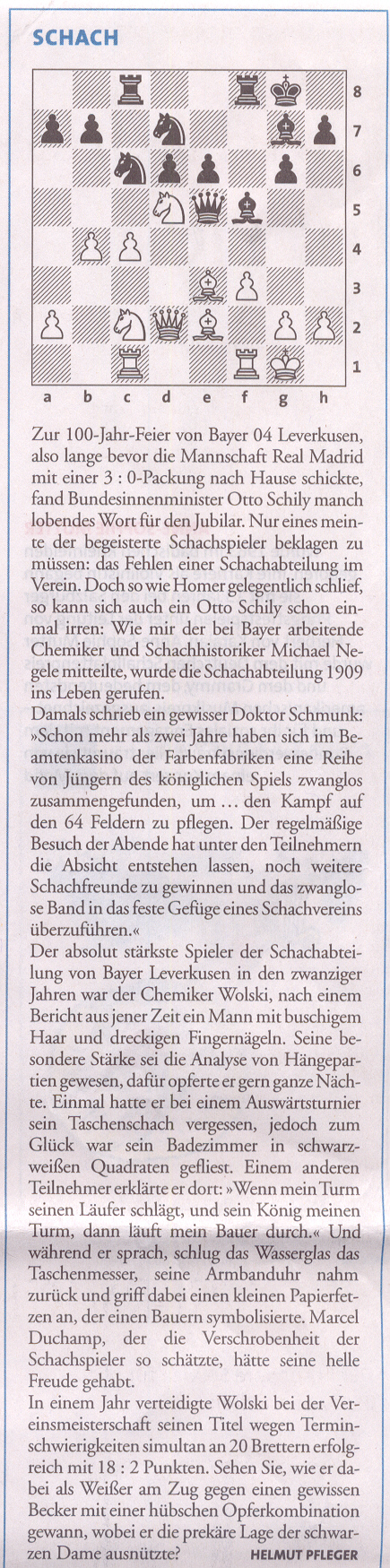 Am 11.11.2004 erschien in der von Helmut Pfleger betreuten Schachspalte der Zeitung "Die Zeit" ein kleiner Artikel zur Historie unseres Vereins (siehe unten). Endlich wird hier einmal richtiggestellt, dass Bayer sehr wohl einen Schachclub - nämlich uns!! - hat. Bei der 100-Jahr-Feier von Bayer 04 Leverkusen wurde das leider vergessen!